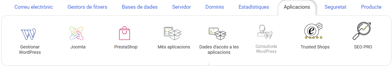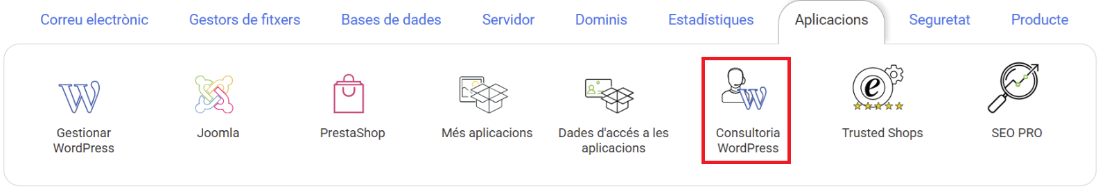 Podeu contractar el servei des de la gestió del hosting que vulgueu que actualitzem. En aquest cas, haureu d'accedir fins a la secció d' Aplicacions i clicar sobre Consultoria Wordpress :