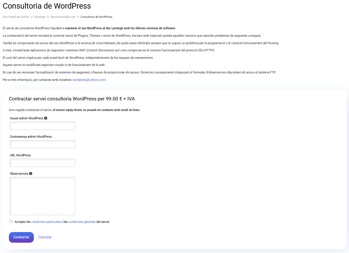 Si voleu consultar algun dubte sobre el servei, també podeu fer-ho mitjançant l'adreça de correu wordpress@cdmon.com .Quin és el cost daquest servei?