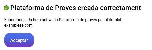 Una vegada indicat el domini, si acceptes les condicions i selecciones l'opció de "Crear plataforma de proves", començarà el procés de creació. En finalitzar sortirà un missatge indicant que s'ha realitzat amb èxit