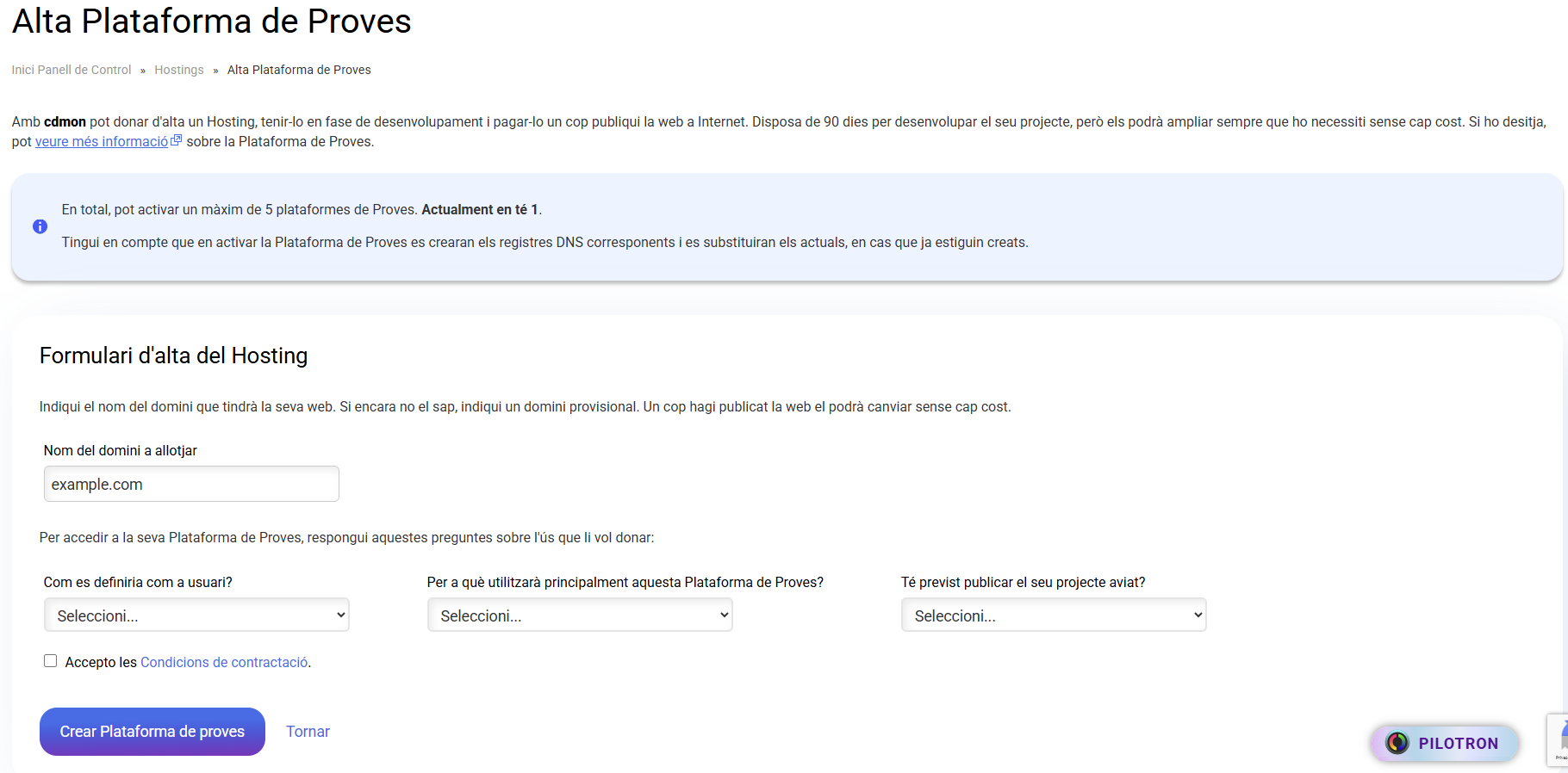 Un cop validat com a usuaris de cdmon, apareixerà la pàgina on podràs finalitzar el procés de creació de la plataforma de proves. Aquí has d'indicar com és el domini al qual vols vincular la plataforma de proves.