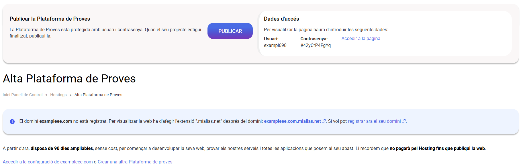 La plataforma de proves és un servei gratuït que permet disposar d'un espai hosting sense necessitat que tingui un domini apuntant a aquesta plataforma de proves. Això vol dir que es pot accedir a la plataforma de proves amb un accés "intern", que és ...