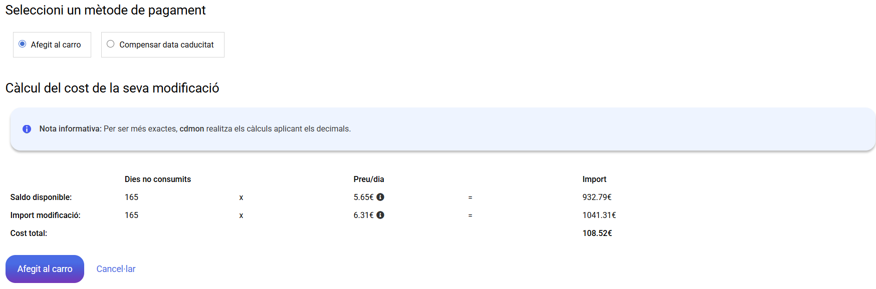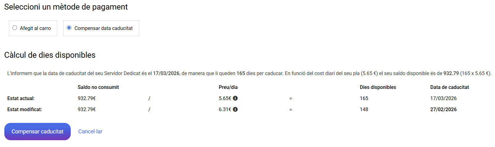 Des d'aquesta mateixa pantalla heu de seleccionar el mètode de pagament per fer el canvi, o bé fent el pagament directament de l'ampliació o bé podeu compensar la data de caducitat del vostre servidor perquè redueixi la data de caducitat del producte en funció del cost d'aquesta ampliació: