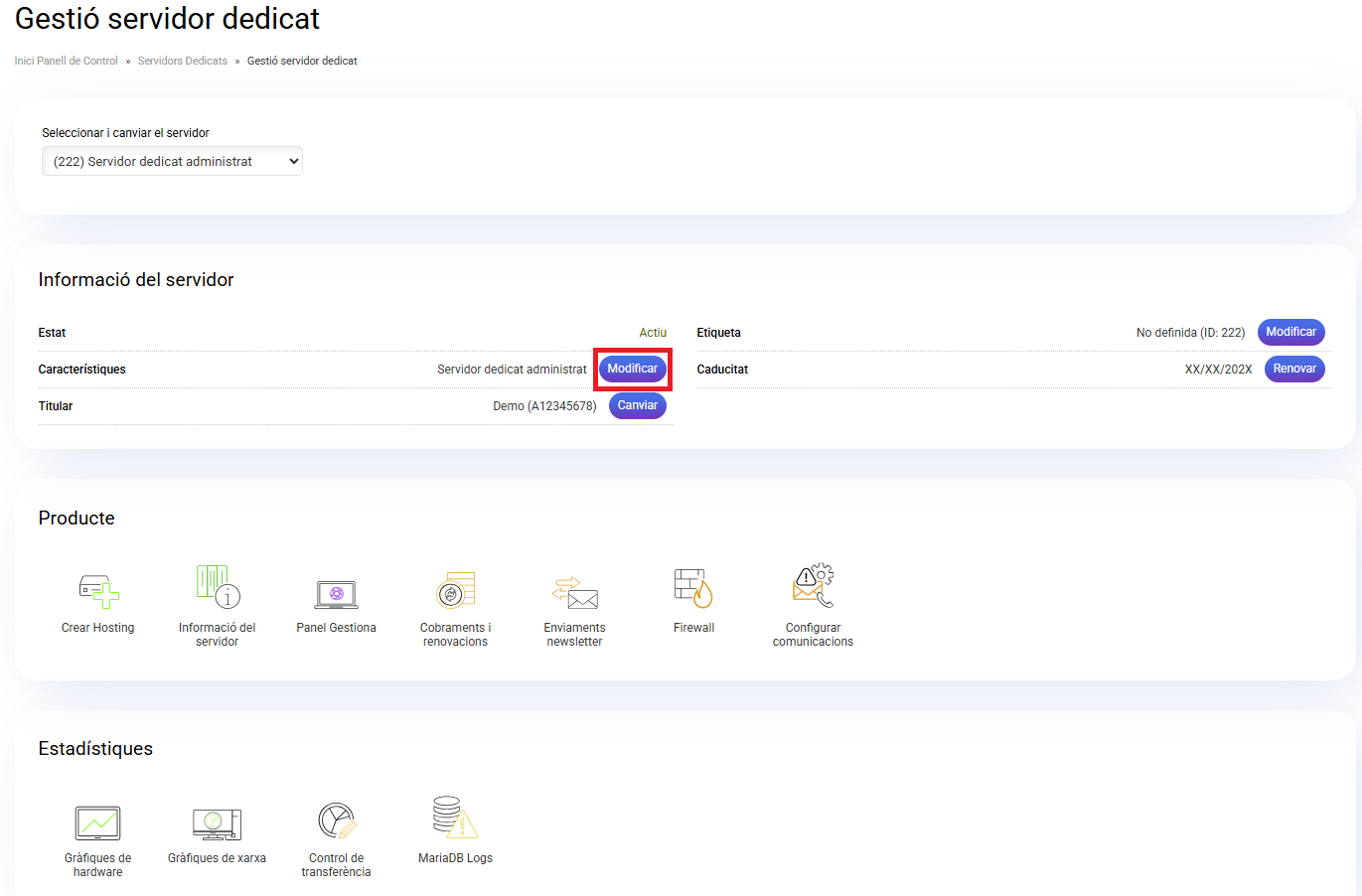 Si necessites ampliar les característiques del teu servidor Dedicat Administrat, has d'accedir a la gestió del servidor des del panell de control de cdmon i prémer en l'opció Modificar.