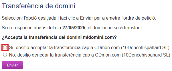 Una vegada hagueu seleccionat Sí, desitjo acceptar la transferència cap a CDmon.com (10Dencehispahard, S.L.) i fet clic a Enviar, us apareixerà la confirmació de la transferència.