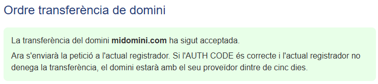A partir d'aquest moment, sereu informats de l'estat de la transferència mitjançant correu electrònic. Des que el contacte administratiu l'aprova fins que el domini està transferit completament a cdmon solen passar 5 dies. Que trigui menys depèn exclusivament del proveïdor de sortida.
