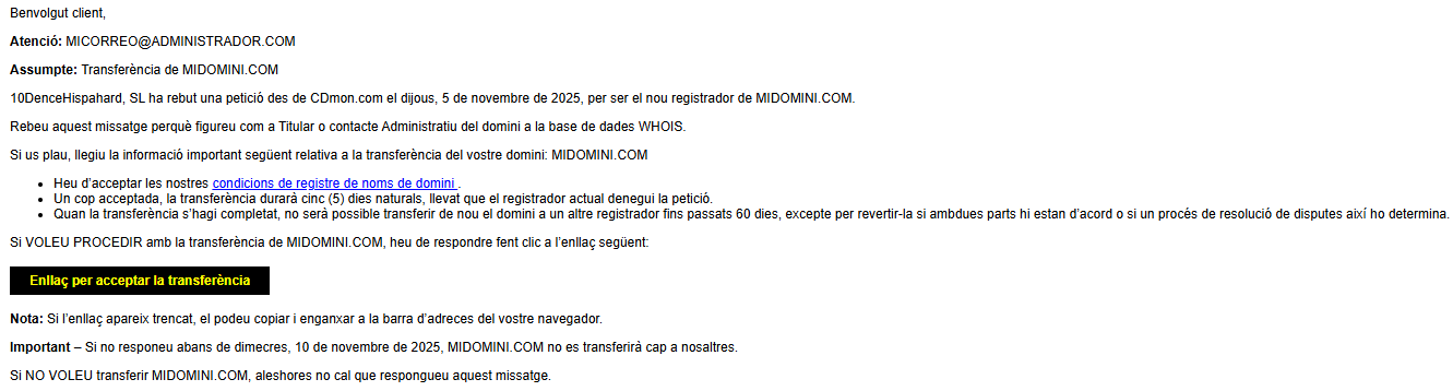 Heu de localitzar el correu electrònic per a l'acceptació en el compte de correu del contacte administratiu. És un correu enviat des de CDmon.com i amb l'assumpte CDmon.com Transfer Authorization for midominio.com - Autorització de transferència de midominio.com (on midominio.com serà el domini per transferir). El cos del missatge és semblant al de la imatge següent: