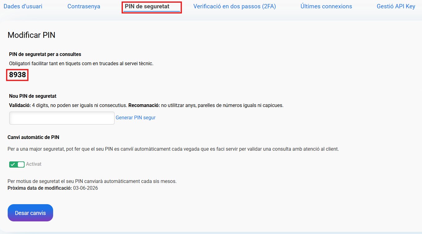 Aquest PIN és necessari per fer consultes telefòniques o obrir tiquets.