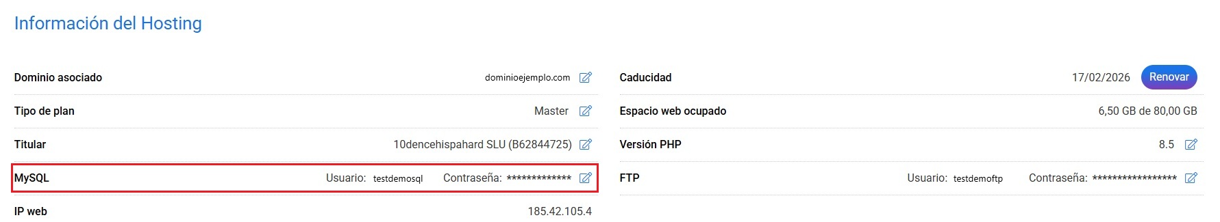 Les dades d'accés MySQL els trobaràs en el resum de dades a l'inici de la pantalla de la gestió de l'allotjament, en Informació del Hosting.