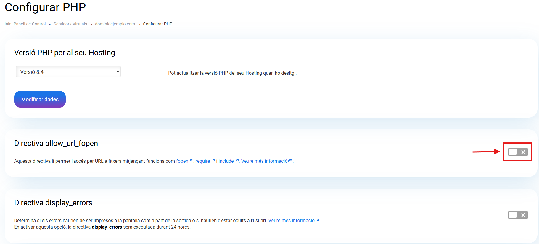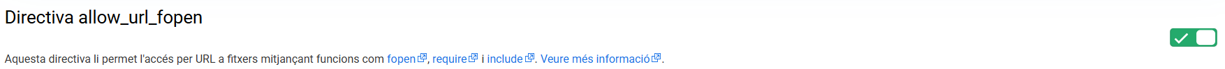 Un cop aquí, ha d'anar fins a "Directiva allow_url_fopen" i verificar que el botó d'aquesta columna estigui activat. En cas de que aparegui con a Desactivat s'ha de clicar a sobre per activar-ho.