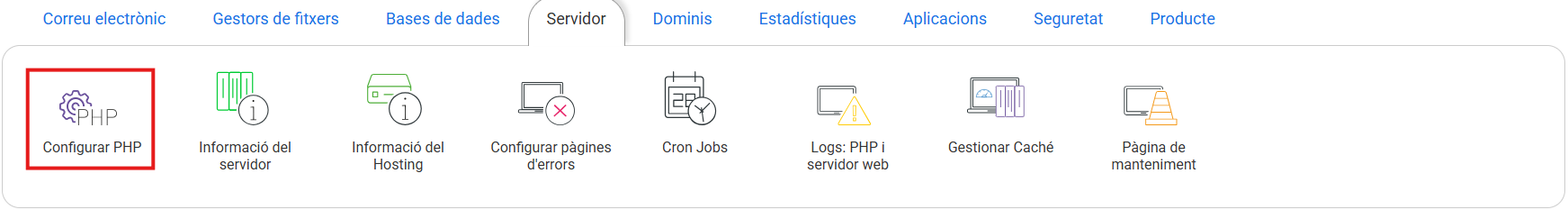 La directiva allow_url fopen li permet l'accés per URL a fitxers mitjançant funcions com fopen, require i include. Molts plugins de varis CMS (Wordpress, Prestashop, etc) requereixen que allow_url_fopen estigui activat en el nostre hosting. Aquest valor es pot activar des de la gestió del hosting que vol configurar. A d'anar fins la columna de "Servidor" i accedir a "Configurar PHP":