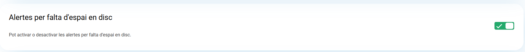 Les alertes per falta d'espai permeten rebre notificacions quan l'allotjament s'està quedant sense espai per emmagatzemar més contingut.