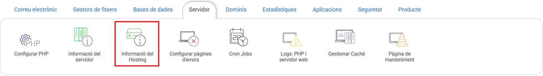 Per poder activar aquestes alertes has d'accedir a la gestió de l'allotjament del panell de control de cdmon, i en l'apartat 'Servidor' prem a l'opció Informació de l'allotjament.
