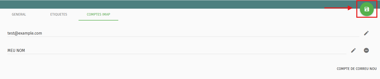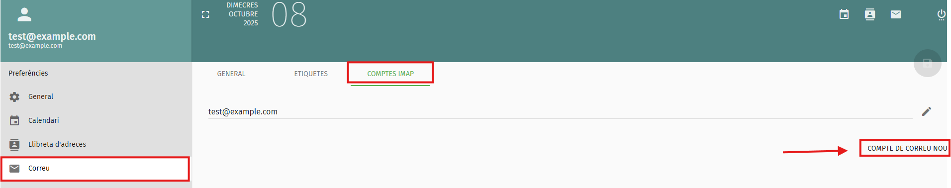 - Per defecte, veurà llistat el seu compte principal. Per afegir-ne un de nou, faci clic al botó "NOU COMPTE DE CORREU".