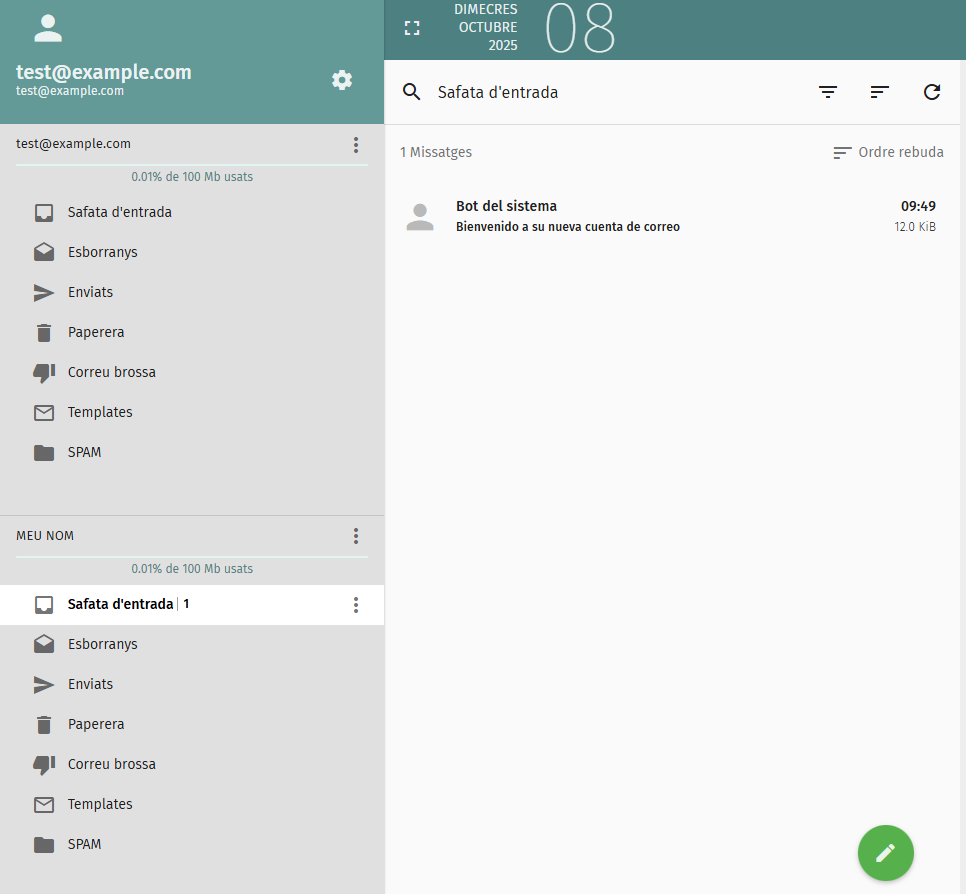 Torni a la vista principal de "Correu". Al menú lateral esquerre o al selector de comptes de la cantonada superior esquerra, ara veurà llistats tots dos comptes.