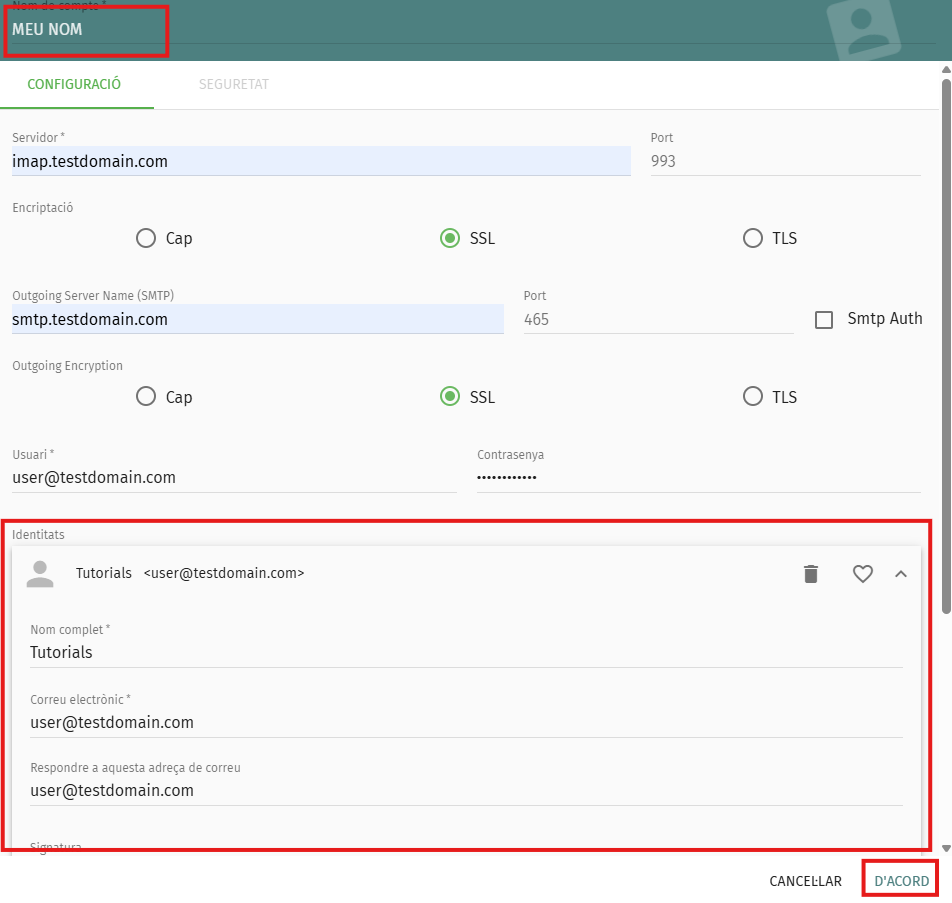 S’obrirà una finestra de configuració. Completi els camps amb la informació del compte que desitja afegir.