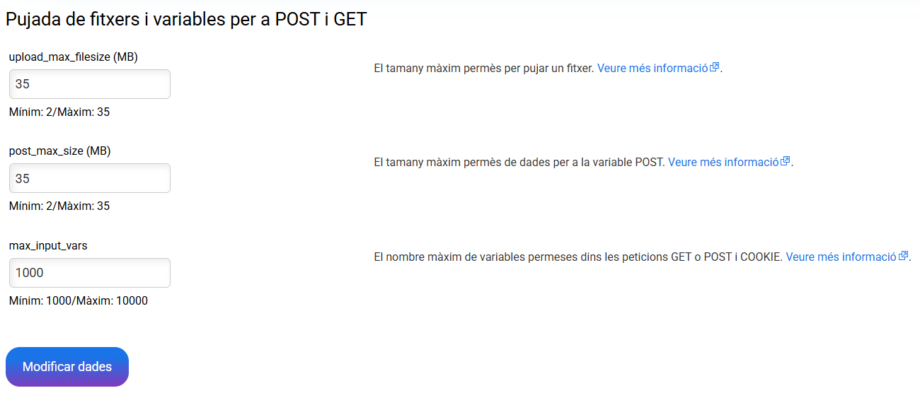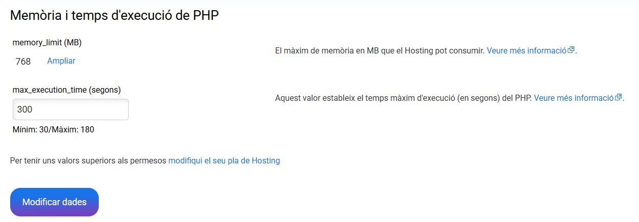 Com augmentar o reduir els valors PHP del nostre hosting