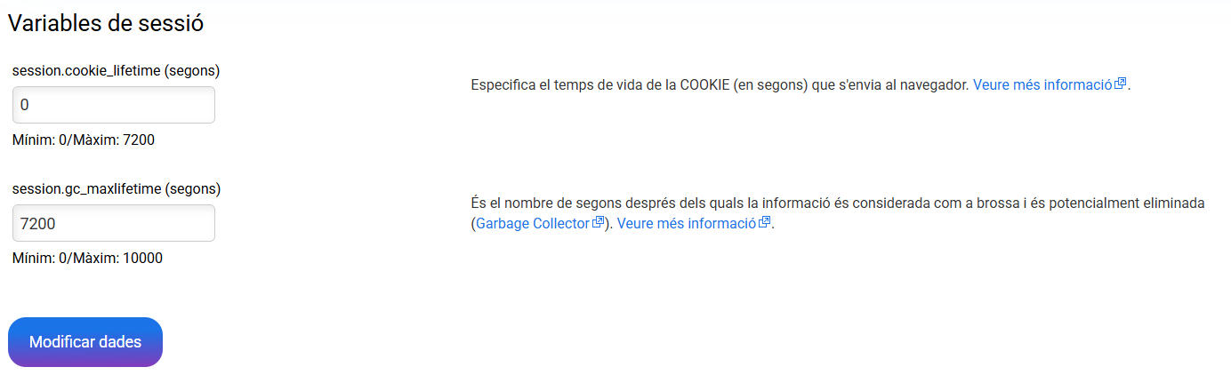 Pot veure més informació de cadascun dels valors en l'enllaç que té a la seva dreta, li portarà a la web oficial de php.net