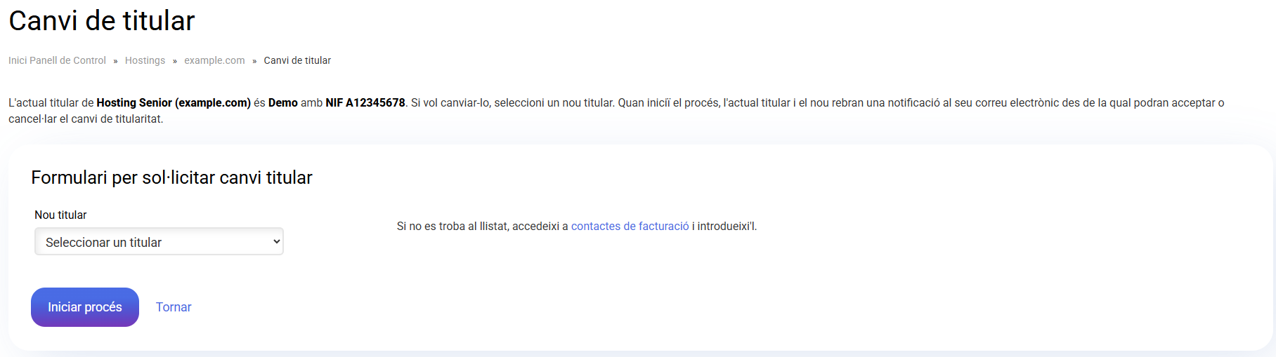 IMPORTANT: Cal esmentar que la facturació sempre es genera a nom del titular de l'allotjament. És important que tingui això en compte en el moment de fer un canvi de titularitat del hosting.