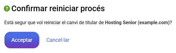 Si per qualsevol motiu decideixes reiniciar el procés, podràs reiniciar prement en l'opció Reiniciar a l'apartat "Reiniciar canvi de titular". Es mostrarà un panell de confirmació per acceptar la cancel·lació del procés.