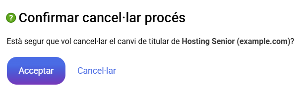 En el cas que decideixis interrompre la gestió per qualsevol motiu, podràs cancel·lar-la prement, a l'apartat "Cancel·lar canvi de titular", el botó Cancel·lar, que mostrarà un panell de confirmació per acceptar la cancel·lació del procés.