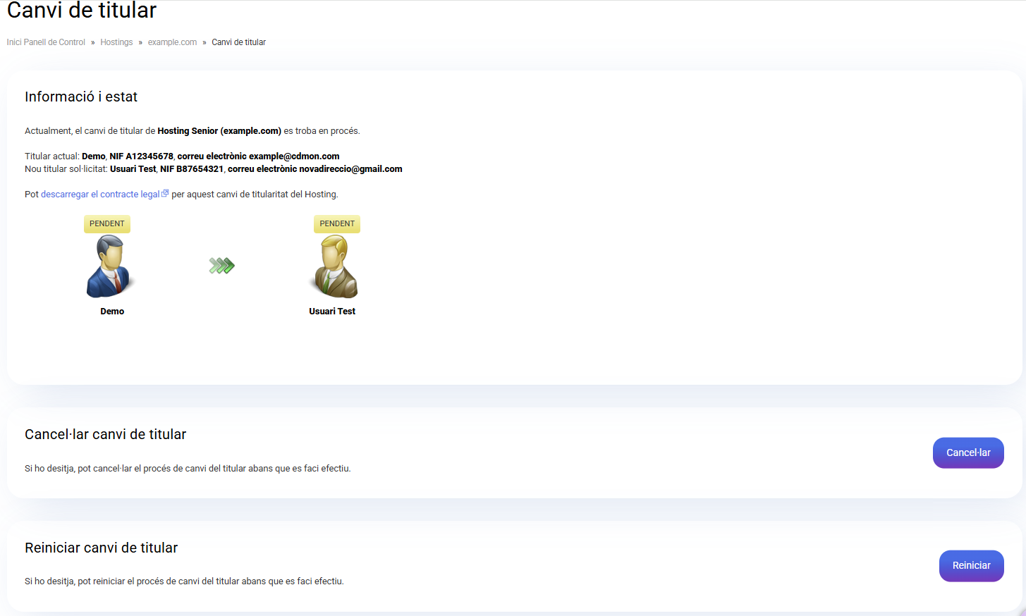 El titular actual es mostra a l'esquerra i apareixerà "Pendent" fins que accepti el canvi des del missatge que rebrà en el compte de correu associat al seu contacte de facturació. La icona de la dreta correspon al nou titular, i també es visualitza com a "Pendent" fins que accepti el seu propi missatge que rebrà al compte de correu que figura en el seu contacte de facturació.
