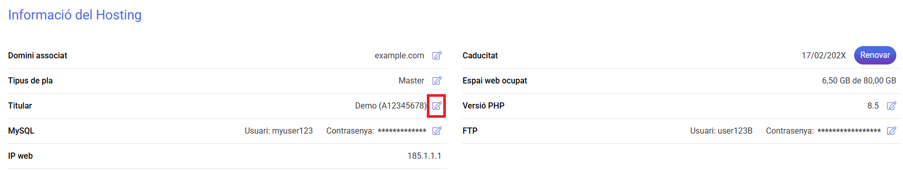 Des del Panell de control de cdmon pots modificar el titular de qualsevol dels teus productes d'allotjament.