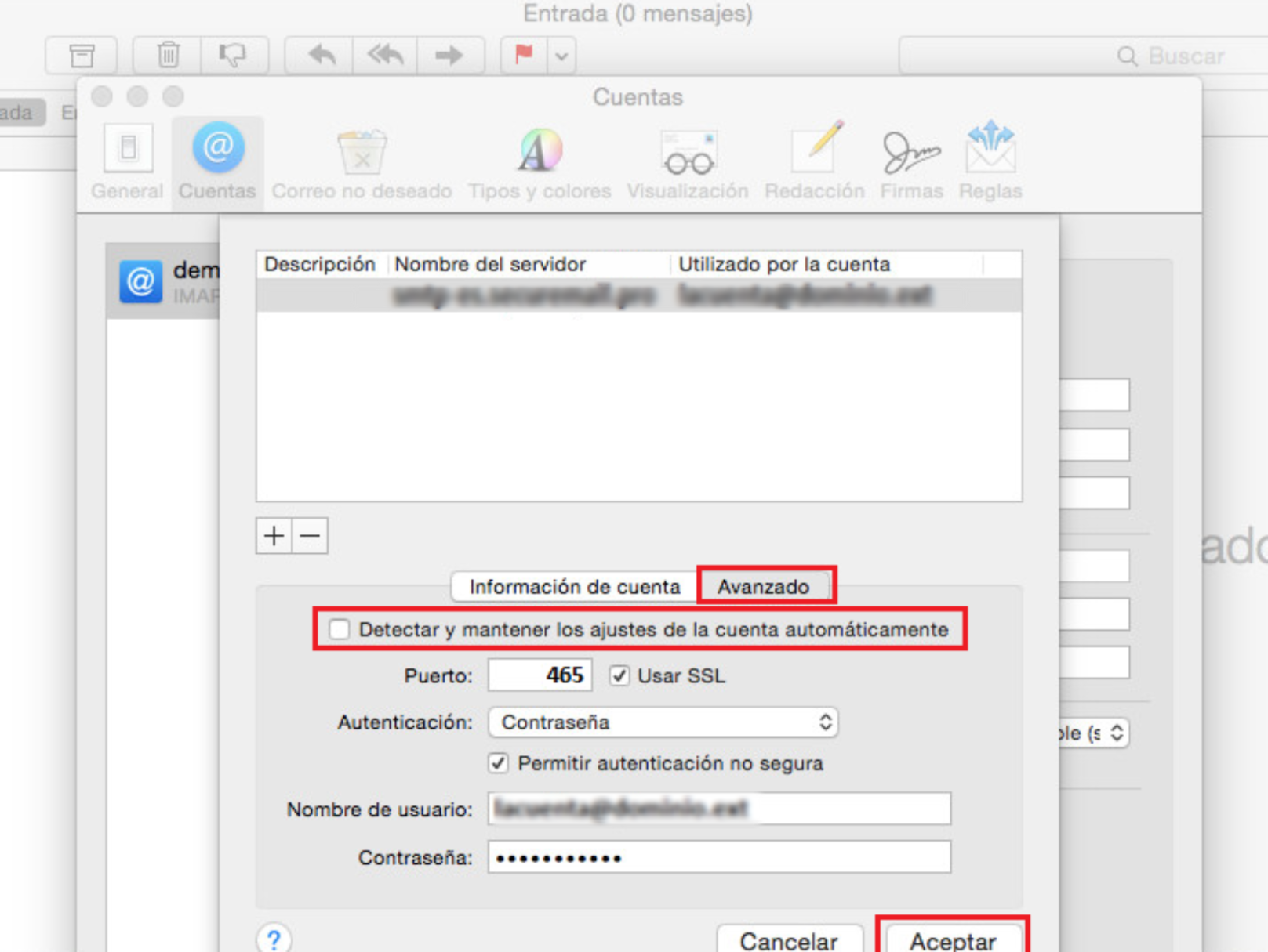 A la finestra que s'obra selecciona el servidor de sortida (smtp.elteudomini.com) del compte que has creat i prem a la pestanya Avançat. Dins has de realitzar les següents modificacions:
