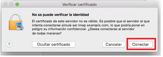 Si apareix un missatge de verificació de certificat, fes clic sobre el botó Mostrar certificat, selecciona Confiar sempre en '.srv.cat' al connectar amb imap.example.com i prem l'opció Connectar.