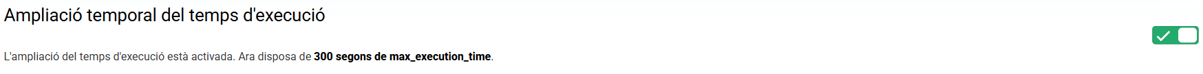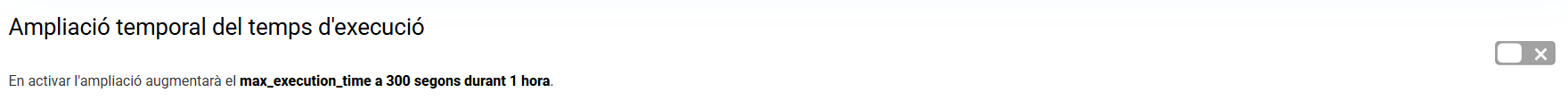 Pots activar temporalment (1 hora) el límit de memòria i el temps d’execució a 512 MB i 300 segons. Aquesta ampliació permet realitzar importacions de contingut pesades, actualitzar el CMS o fer instal·lacions a l’allotjament.
