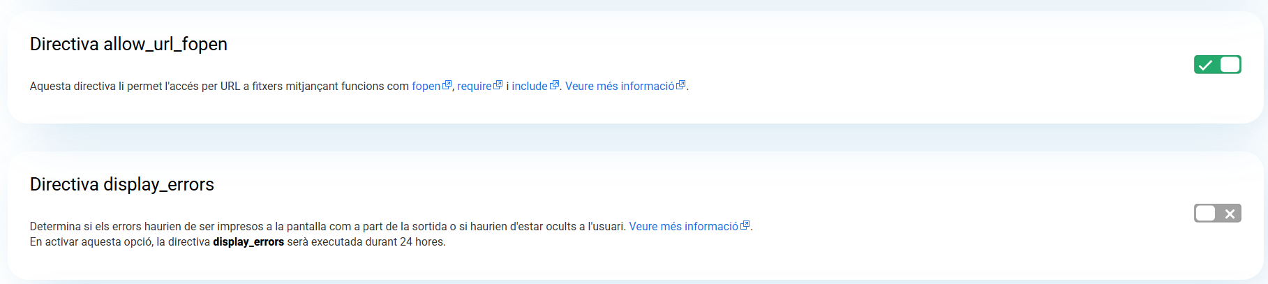 Finalment, pots canviar la directiva allow_url_fopen per ajustar-la a la teva programació, mentre que la directiva display_errors et permet desactivar el control d’errors generats per l’allotjament per ocultar-los en cas necessari.