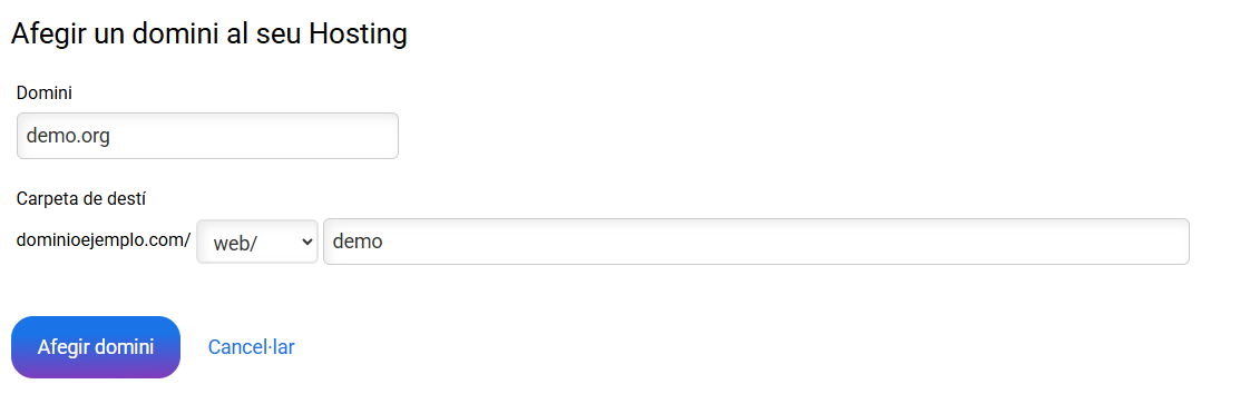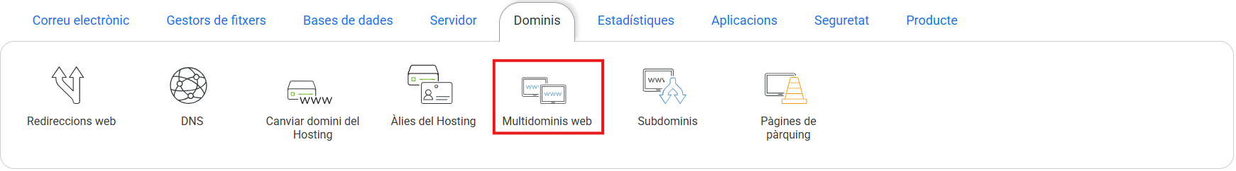 El servei de multidominis web del Panell de control permet allotjar altres dominis en subcarpetes del teu allotjament web. Aquesta eina serveix per allotjar projectes que no necessitin gaires recursos ni correu electrònic.