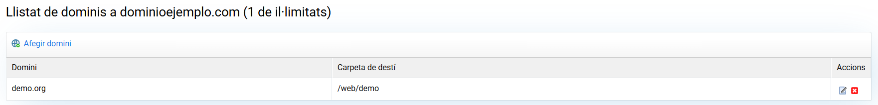 Els dominis creats apareixen en el llistat, des d'on els pots editar o esborrar.
