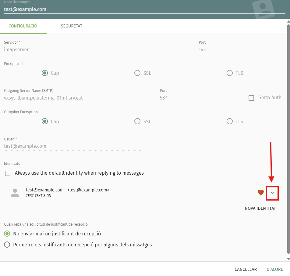 - Un cop desplegada la identitat, veureu un formulari amb els camps del compte. Al camp Signatura, escriviu el vostre text o enganxeu el contingut.