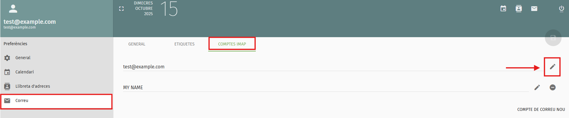 - Per defecte apareixerà el compte principal de SOGo. Per modificar el compte on voleu afegir la signatura, feu clic a la icona llapis (Editar) al costat del compte.