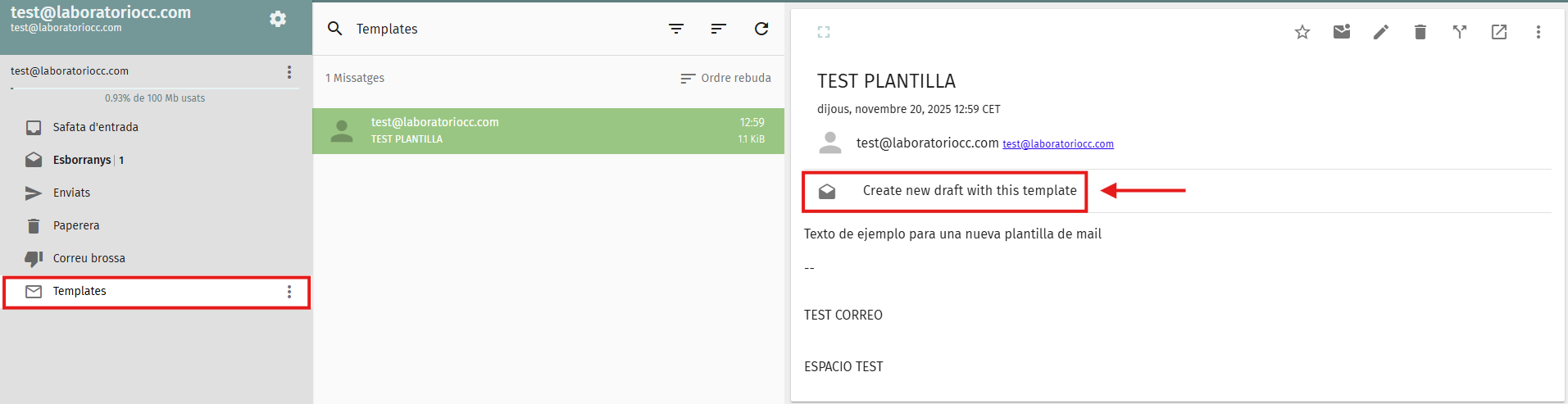 Anau a la carpeta Templates i seleccioneu la plantilla que voleu utilitzar. A la part dreta, on es mostra el contingut del correu, feu clic a Crear un nou esborrany amb aquesta plantilla.