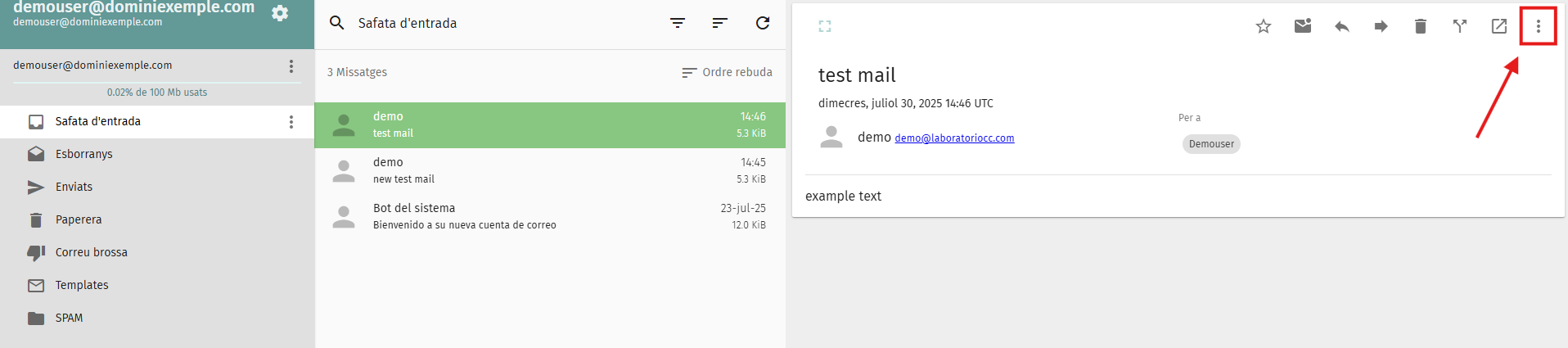 Una vegada accedeixes al correu web Roundcube, pots visualitzar una pantalla amb els diferents elements que et permetran gestionar els teus missatges.