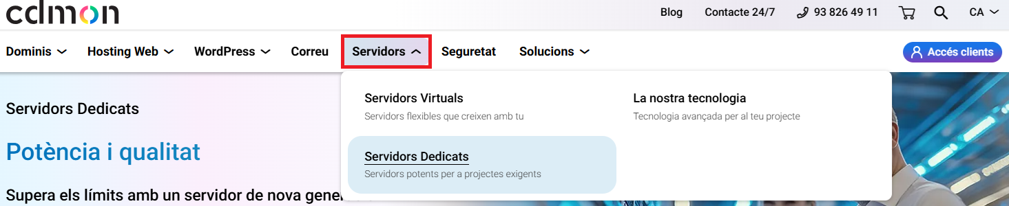 El primer pas per donar d'alta un Servidor Dedicat amb nosaltres és accedir a la nostra web comercial cdmon.com. Des d'aquesta pàgina podeu veure tota la informació que necessiteu sobre els nostres productes i també sobre cdmon. Per donar d'alta el nou servidor, heu d'anar fins a la part superior esquerra, a la secció de "Servidors" i accedir a "Servidors Dedicats":