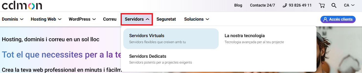 El primer pas per donar d'alta un Servidor Virtual amb nosaltres és accedir a la nostra web comercial cdmon.com. Des d'aquesta pàgina podeu veure tota la informació que necessiteu sobre els nostres productes i també sobre cdmon. Per donar d'alta el nou servidor, heu d'anar fins a la part superior esquerra, a la secció de "Servidors" i accedir a "Servidors Virtuals":
