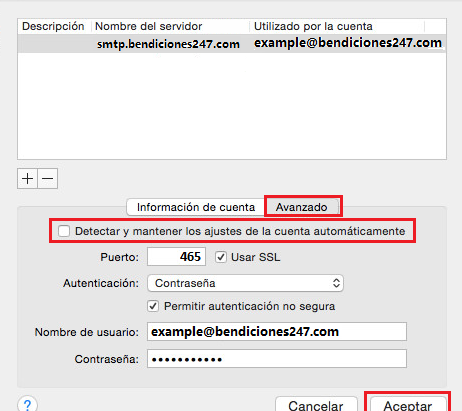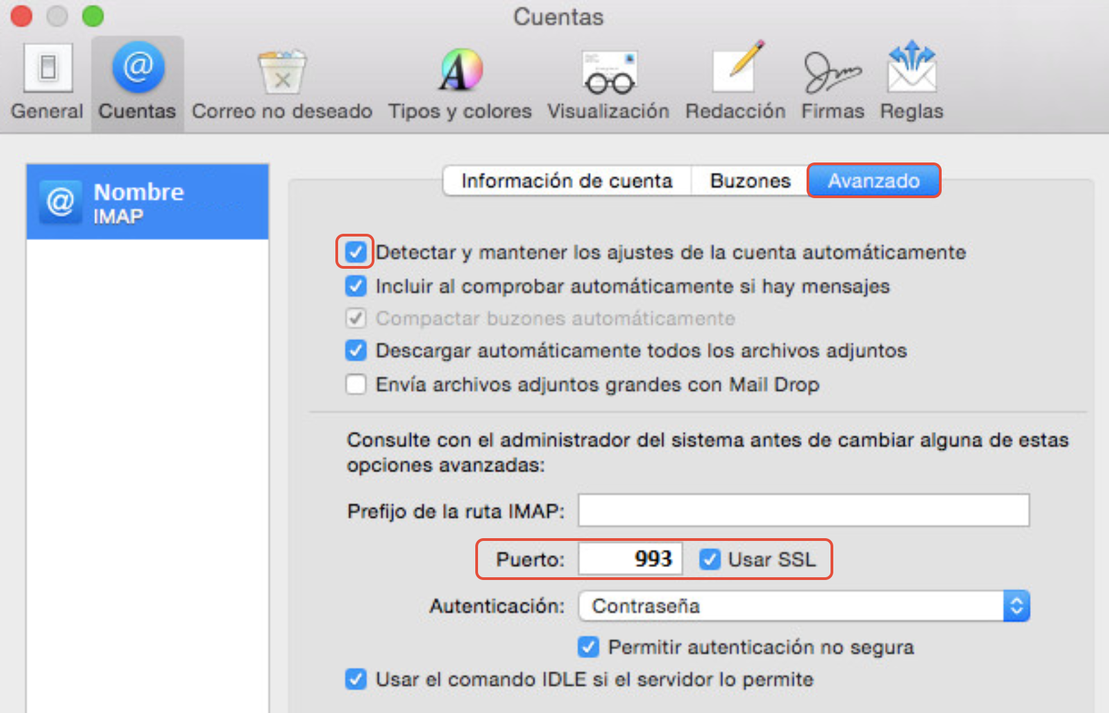En algunes versions de Mail de Mac pot ser que la finestra de "Avanzado" no aparegui, i en contra seu apareix "Ajustes del servidor". La interfície és tal que així: