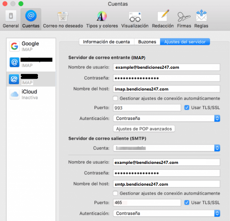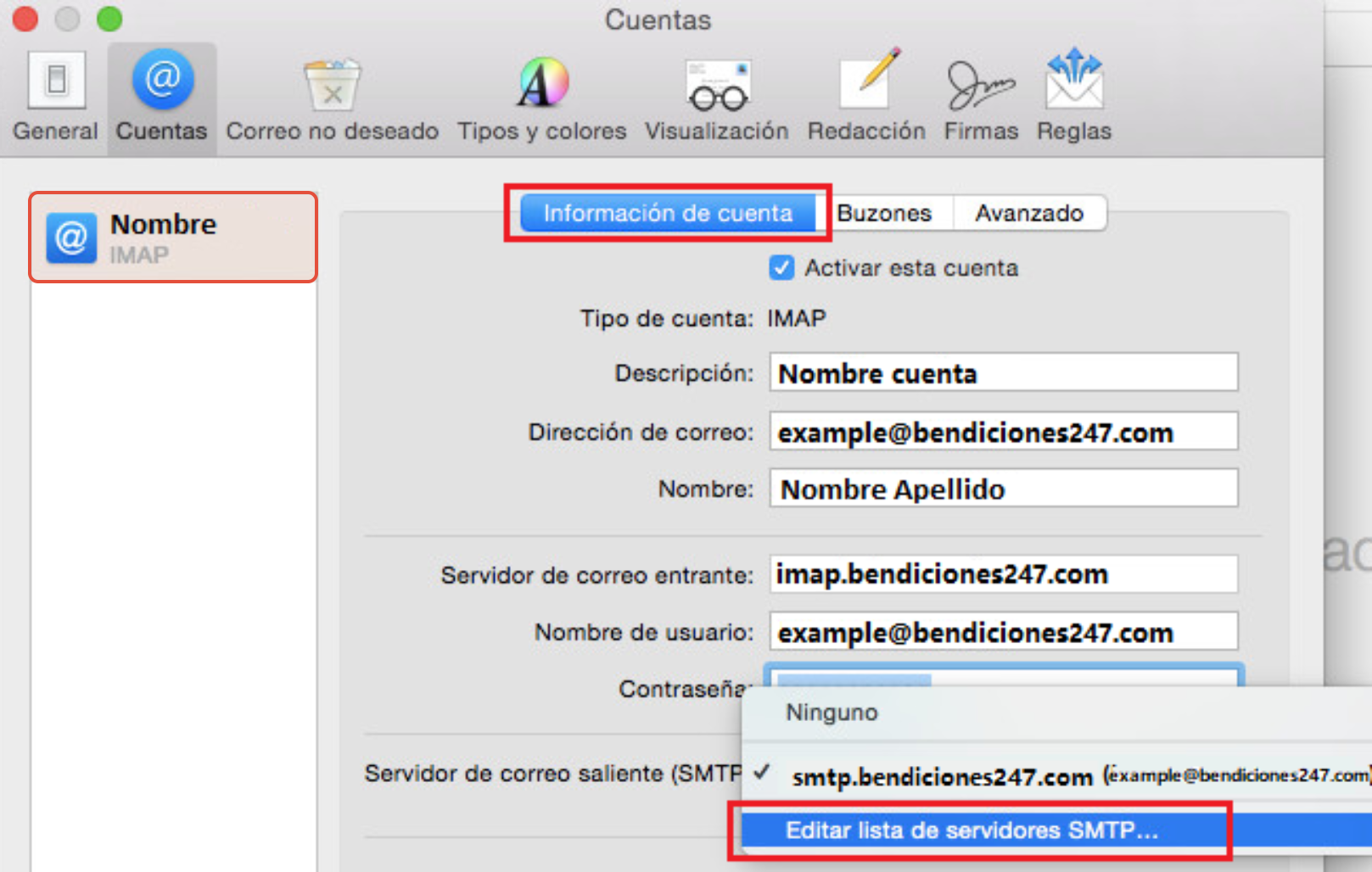 En aquest cas, utilitzem com a exemple el compte “example@bendiciones247.com”, aquesta adreça s'ha de modificar pel nom del compte de correu a configurar.