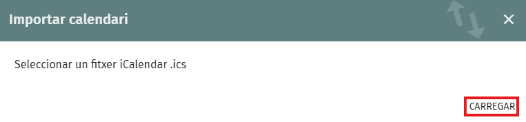 - Apareixerà una finestra on podràs seleccionar l'arxiu. Fes clic al botó Carrega, i selecciona el fitxer .ics exportat anteriorment des de Roundcube.