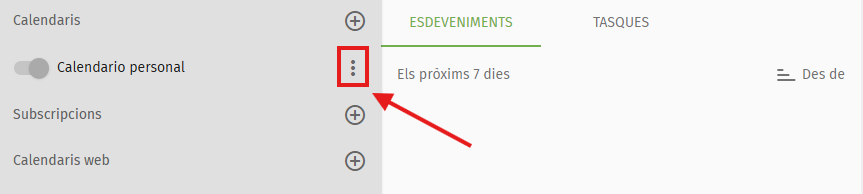 - Selecciona l'opció Calendari personal i fes clic sobre la icona dels tres punts verticals que apareix a la seva dreta. Si no et apareix cap o l'has eliminat sense voler, pots crear-ne un de nou: