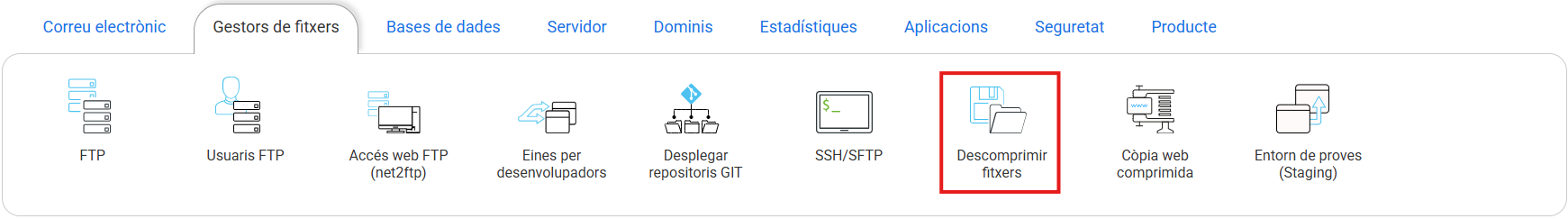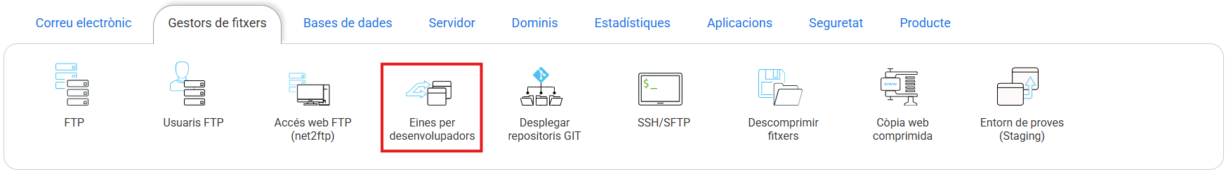 Des de la gestió de l'allotjament, busca la secció "Gestors d'arxius" i selecciona l'opció "Allotjament per a desenvolupadors".