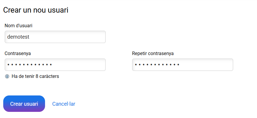 En la següent finestra has d'introduir el nom d'usuari i contrasenya amb la qual protegim la carpeta, i prémer a Crear usuari.