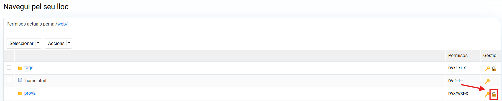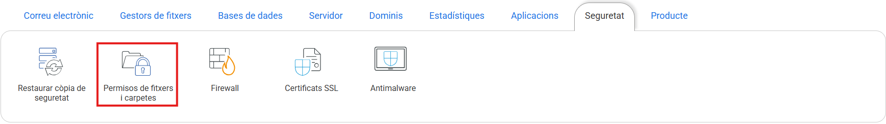 En el Panell de control de cdmon pots activar aquesta protecció. Per realitzar aquesta acció accedeix a la gestió de l'allotjament i en la secció 'Seguretat' prem en l'opció Permisos d'arxius i carpetes.