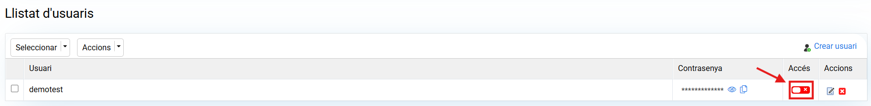 A continuació, podràs observar que l'usuari que has creat està en estat "Desactivat". Prem en la icona de la clau, a l'apartat de "Accions", per activar-ho i protegir la carpeta.