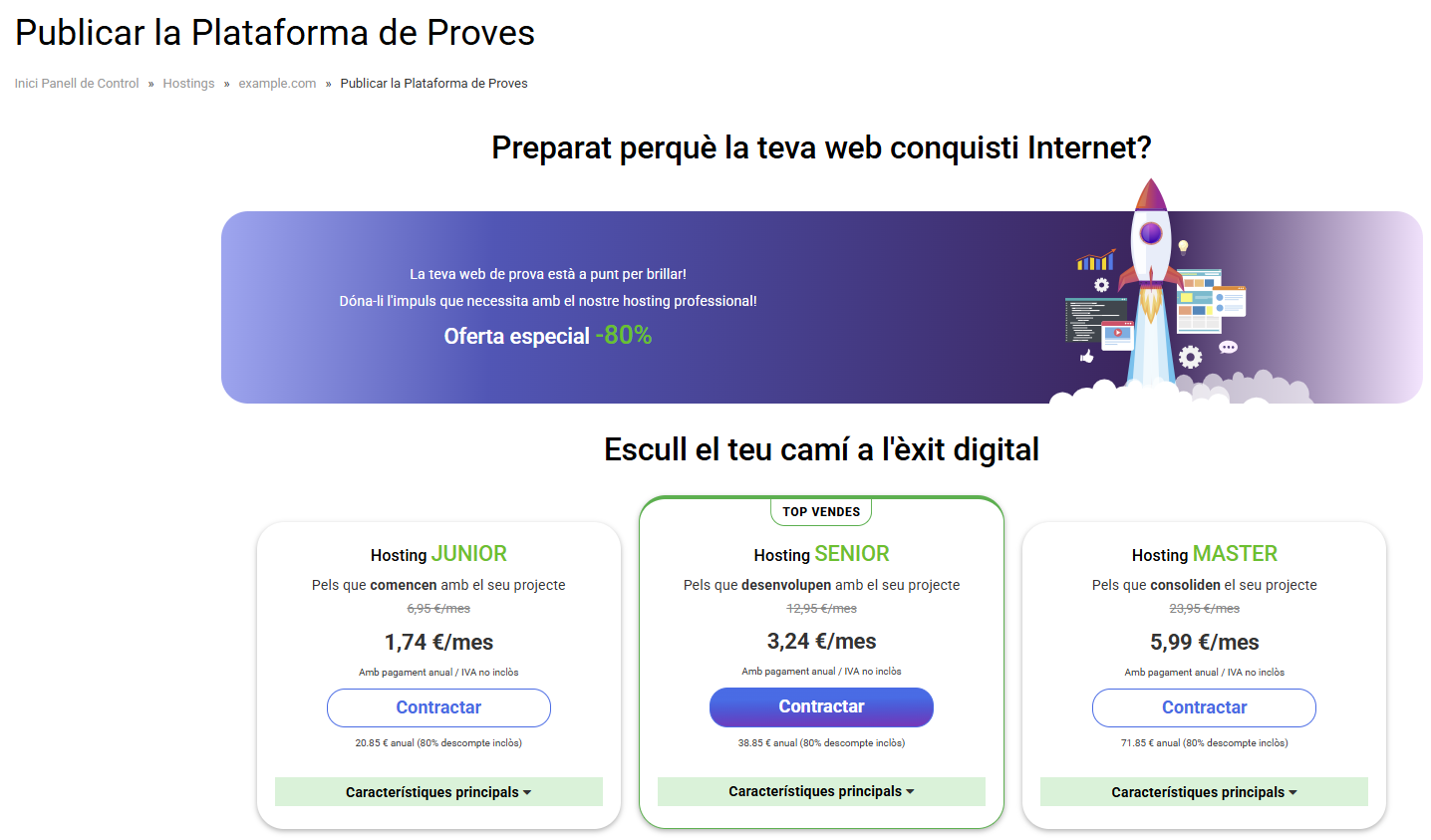 La Plataforma de proves et permet configurar el projecte en els servidors de cdmon, de manera que quan estigui totalment operatiu, només has de contractar un allotjament des de la mateixa plataforma.