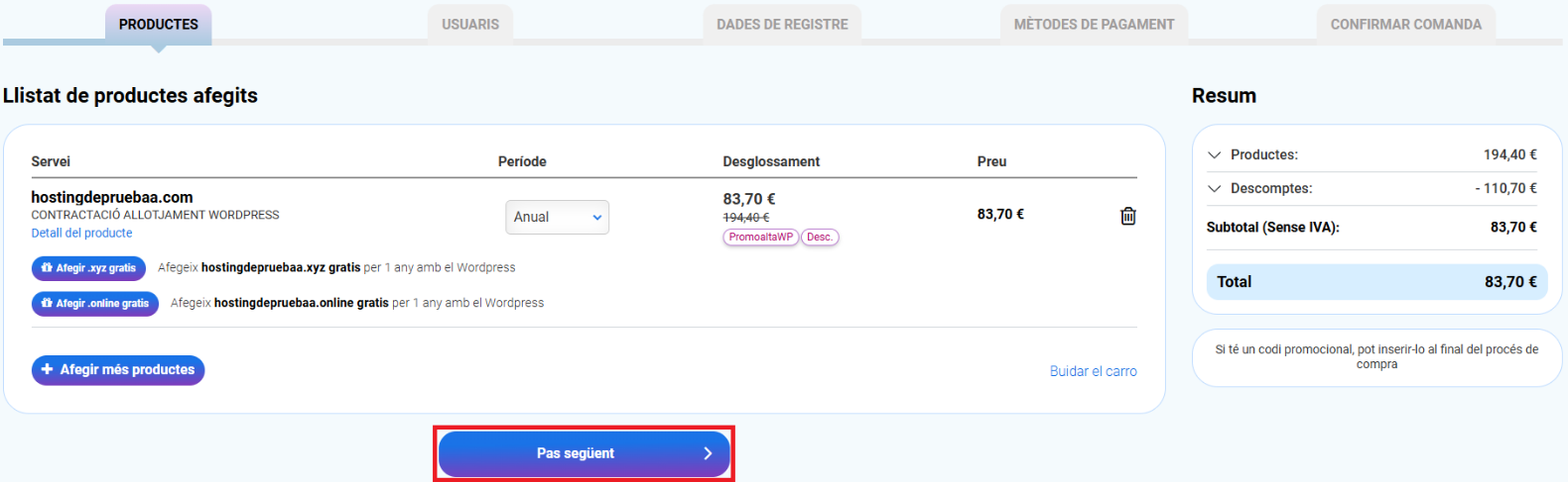 Si decideixes contractar el hosting, fes clic a Contractar i publicar la meva web, i seràs redirigit al procés de compra del nostre lloc web comercial.