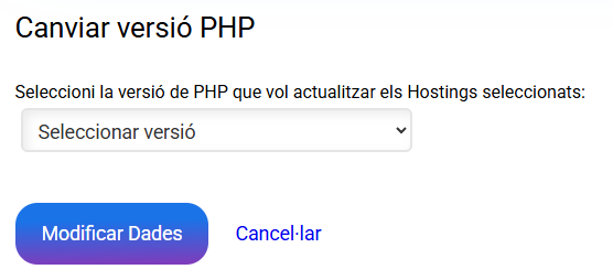 En accedir a la primera opció de "Canviar versió de PHP", el panell et redirigirà a un desplegable amb el qual pots seleccionar la versió de PHP que vols assignar a tots aquests allotjaments. Un cop seleccionada la versió, has de fer clic a "Modificar Dades":