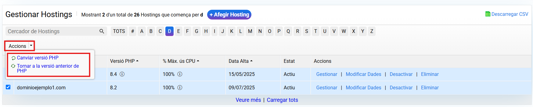 Un cop ja estiguin els allotjaments seleccionats, has de fer clic a "Accions" i es mostraran les opcions de "Canviar versió de PHP" i "Tornar a la versió anterior de PHP":